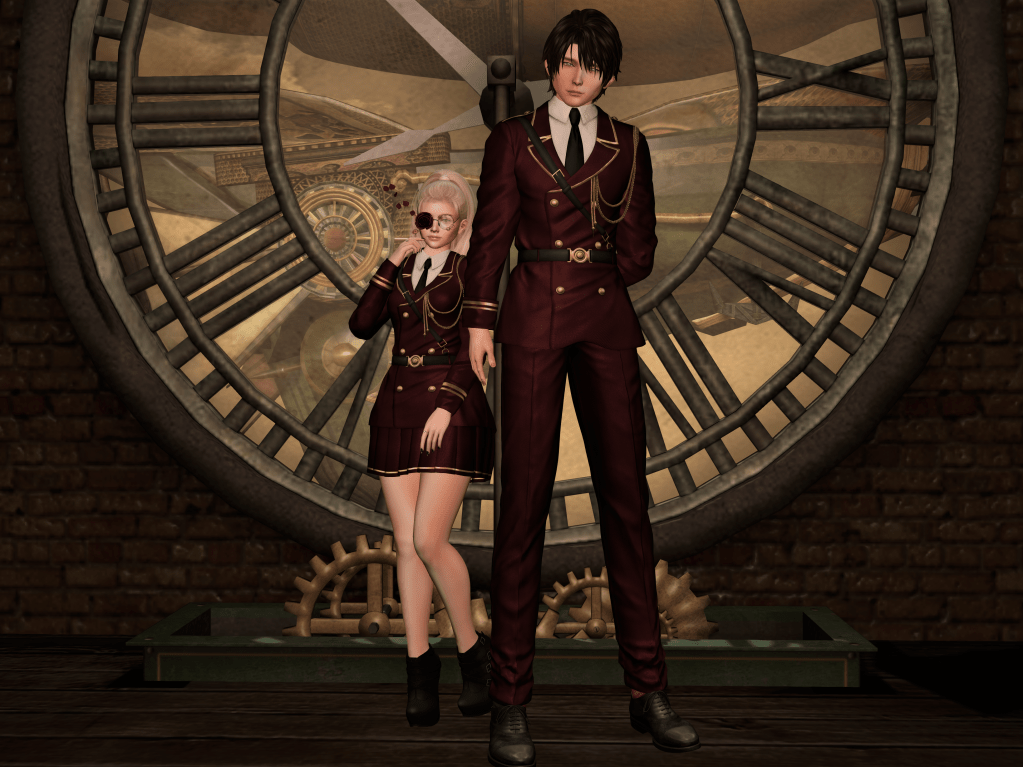 We just passed May the 4th, and we wanted to make a space themed post. In the image we are wearing a uniform created by Toksik. We liked all the colors, but the maroon color caught my attention. It’s also a plus that the uniform can be worn by both women and men. The image background is set inside a futuristic steampunkish building in outer space with a flying ship right outside the window.